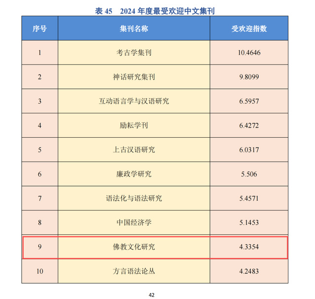 《最受欢迎期刊报告(2024年度)》基于国家哲学社会科学文献中心目前共收录的180种中文集刊,2024年1月1日以前上线且有阅读量、下载量的中文集刊有80种,通过统计国家哲学社会科学文献中心收录各学科集刊论文的阅读量、下载量,参照期刊受欢迎指数的计算方式,计算出80种中文集刊的阅读指数、下载指数与受欢迎指数。根据中文集刊受欢迎指数,展示排名前10种最受欢迎中文集刊,《佛教文化研究》位列第九,受欢迎指数4.3354。